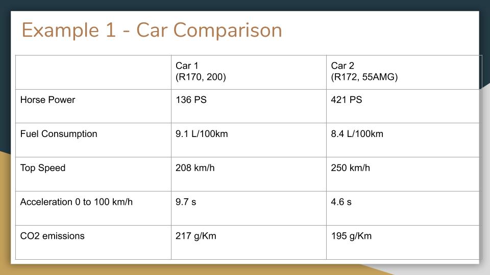 คุณผู้อ่านเห็นด้วยหรือไม่ครับว่า เวลาที่เราจะตอบคำถามแต่ละข้อ สิ่งที่เราทำกันคือ ย้อนกลับไปดูตัวเลขต่างๆในตาราง และหาค่าที่เราสนใจ ยกตัวอย่างเช่น เวลาถามว่ารถคันไหนแรงกว่า เราดูที่ Horse Power, เวลาดูว่ารถคันไหนประหยัดน้ำมันกว่า เราดูที่ช่อง Fuel Consumption