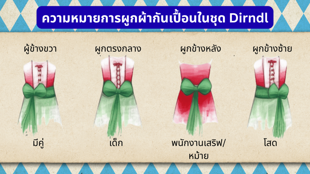 แต่ที่เด็ดกว่านั้นคือชุด “Dirndl” มีภาษาลับซ่อนอยู่ด้วยครับ! อย่างที่บอกไปว่าถ้าโบว์ผ้ากันเปื้อนที่ผูกอยู่ด้านซ้ายของหญิงสาว แปลว่าเธอยังโสด พร้อมเปิดรับเพื่อนใหม่! แต่ถ้าผูกอยู่ด้านขวาเมื่อไหร่ นั่นแปลว่าเธอมีเจ้าของแล้ว หรือแต่งงานแล้วนั่นเองครับ นี่ไม่ใช่แค่เรื่องของแฟชั่น แต่ยังเป็นการสื่อสารแบบไม่ใช้คำพูดที่รู้กันในหมู่ผู้ที่มาร่วมงานอีกด้วย ถือเป็นเกร็ดสนุกๆ ที่ทำให้การไปงานเทศกาลนี้มีสีสันและน่าค้นหาขึ้นเยอะเลยครับ