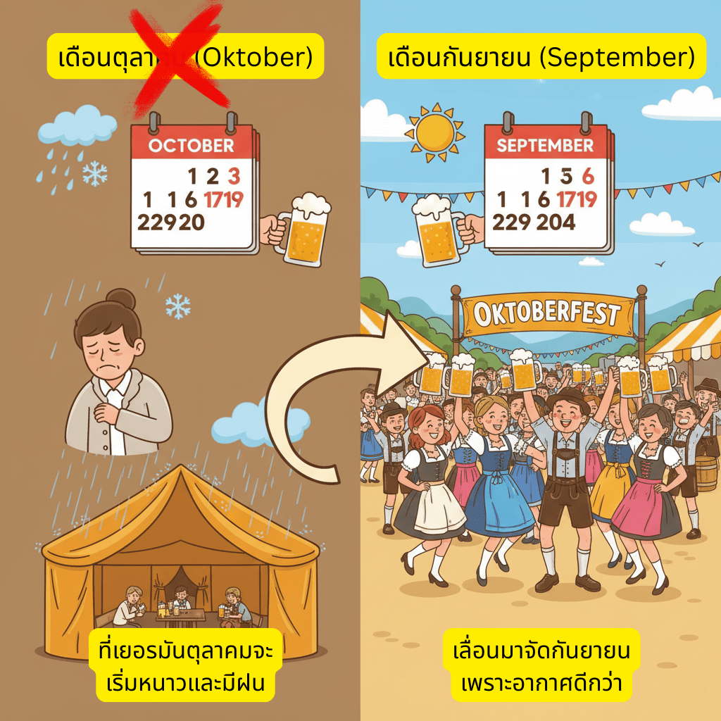เทศกาลที่ชื่อ “เทศกาลเดือนตุลาคม” (Oktoberfest) แต่กลับจัดขึ้นส่วนใหญ่ในเดือนกันยายน! นี่ไม่ใช่เรื่องตลก แต่เป็นเรื่องจริงที่เกิดจากเหตุผลสุดแสนจะเรียบง่ายครับ! ก็เพราะว่าอากาศที่มิวนิกในเดือนตุลาคมมันเริ่มหนาวและมีฝนตกชุกแล้ว การเลื่อนงานให้เร็วขึ้นมาอยู่ในช่วงอากาศดีๆ ของเดือนกันยายนแทน ก็ทำให้ผู้คนสามารถออกมาเฉลิมฉลองกลางแจ้งได้อย่างสบายใจ ไม่ต้องกลัวลมหนาวหรือฝนตก อากาศดีๆ แบบนี้ เบียร์จะได้ไหลลื่น ไม่มีสะดุดยังไงล่ะครับ
