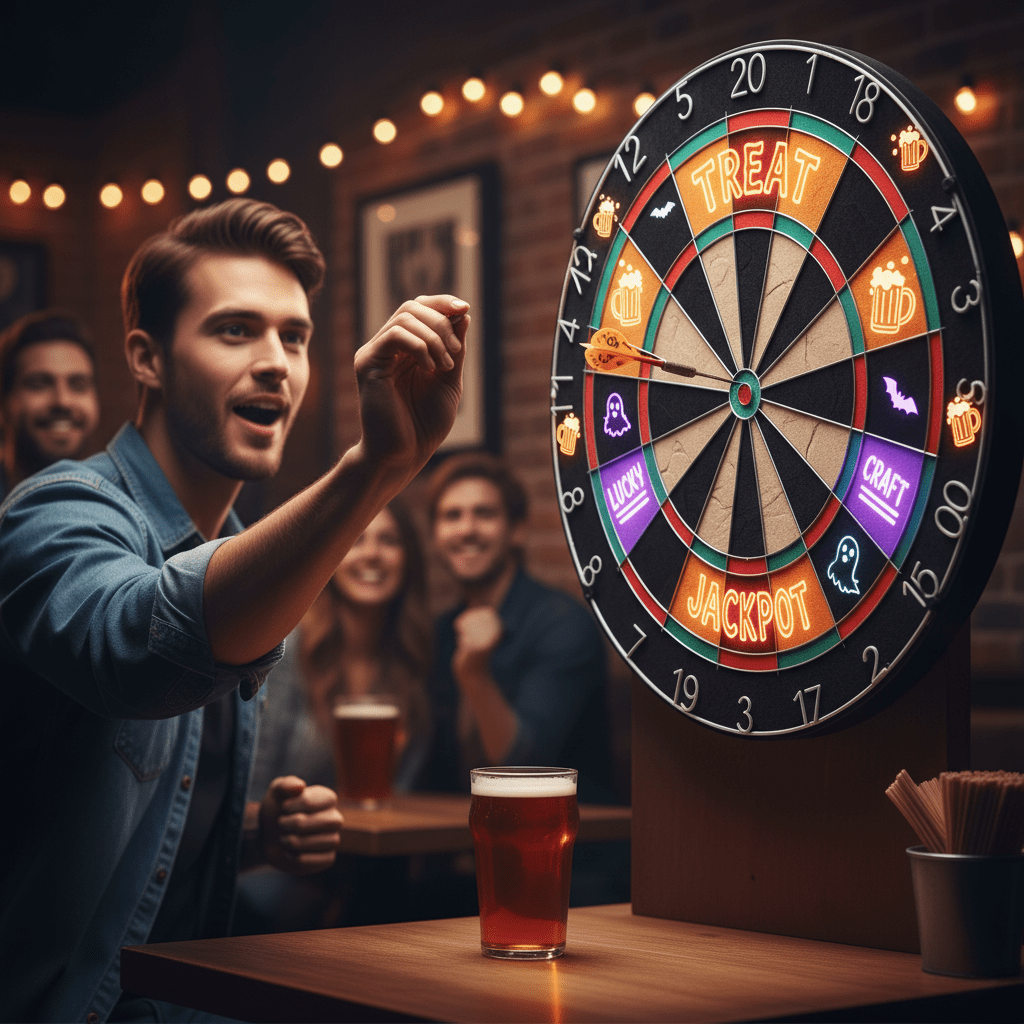 [[Image] spooky_darts_wheel_of_treats.jpg> A decorated darts board with ‘Treat’ zones clearly marked (Lucky, Craft, Jackpot), and a customer excitedly throwing a dart with aspect ratio 16:9 [[/Image]]