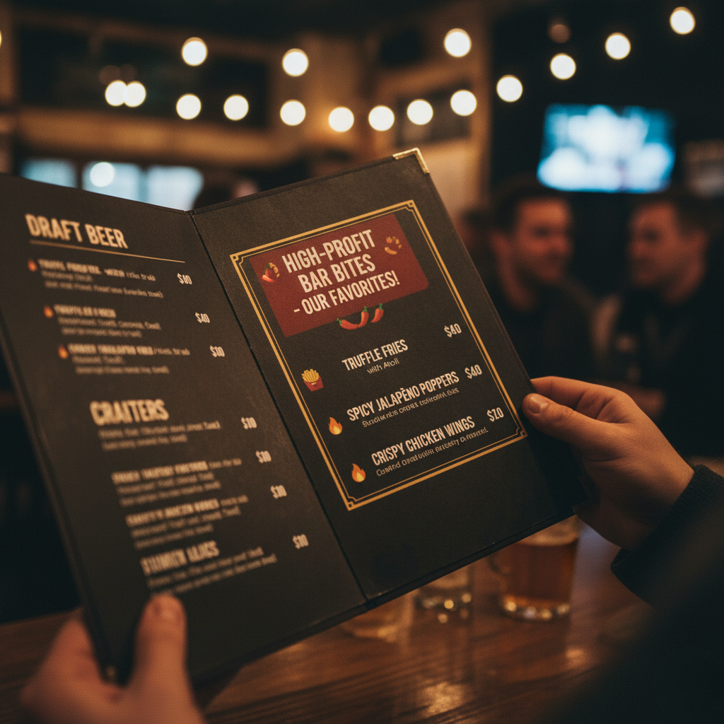 1. การตลาดด้วยสายตา (Menu Engineering): วาง Bar Bites ที่ทำกำไรสูงสุดไว้ในตำแหน่งที่ดีที่สุด เช่น มุมขวาบนของเมนูแผ่นแรก ซึ่งเป็นจุดที่สายตาของลูกค้ามองเห็นเป็นอันดับต้นๆ และต้องใช้ รูปภาพที่น่าสนใจที่สุด เพื่อดึงดูดสายตาของลูกค้าให้เลือกเมนูนั้นทันที