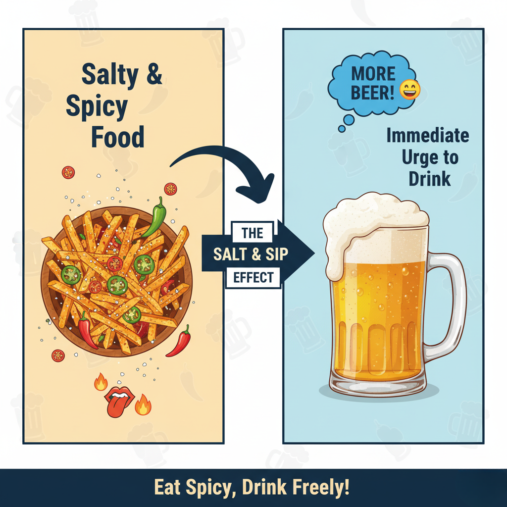 หลักการสำคัญคือ “ความเค็มและความเผ็ด” คือตัวกระตุ้นทางประสาทสัมผัสที่ทรงพลังที่สุด (The Science of Salt & Sip) เมื่อลูกค้าทานของทอดหรือของแกล้มที่มีรสชาติจัดจ้าน เช่น ปีกไก่ทอดรสจัด หรือมันฝรั่งทอดปรุงรสเข้มข้น ร่างกายจะส่งสัญญาณให้เกิดความกระหายน้ำอย่างรวดเร็วทันที